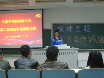 这次比赛旨在弘扬廉洁精神,响应党的十八届三中全会的号召。同时锻炼我们13新生的团队合作能力和演讲口才。毫无疑问这次比赛是成功的,它不仅鼓励了同学们表达对廉洁的不同见解和对当下实事的不同看法,让大家从不同的角度去认识、了解廉政这一永恒的课题,形成了百家争鸣的局面,而且促进了大家相互交流、讨论,加深了同学们之间的了解,增进了同学们的友谊。今后,同学们也将在党的领导下,发扬廉洁文化,为了成为优秀的党员和社会主义建设而努力。