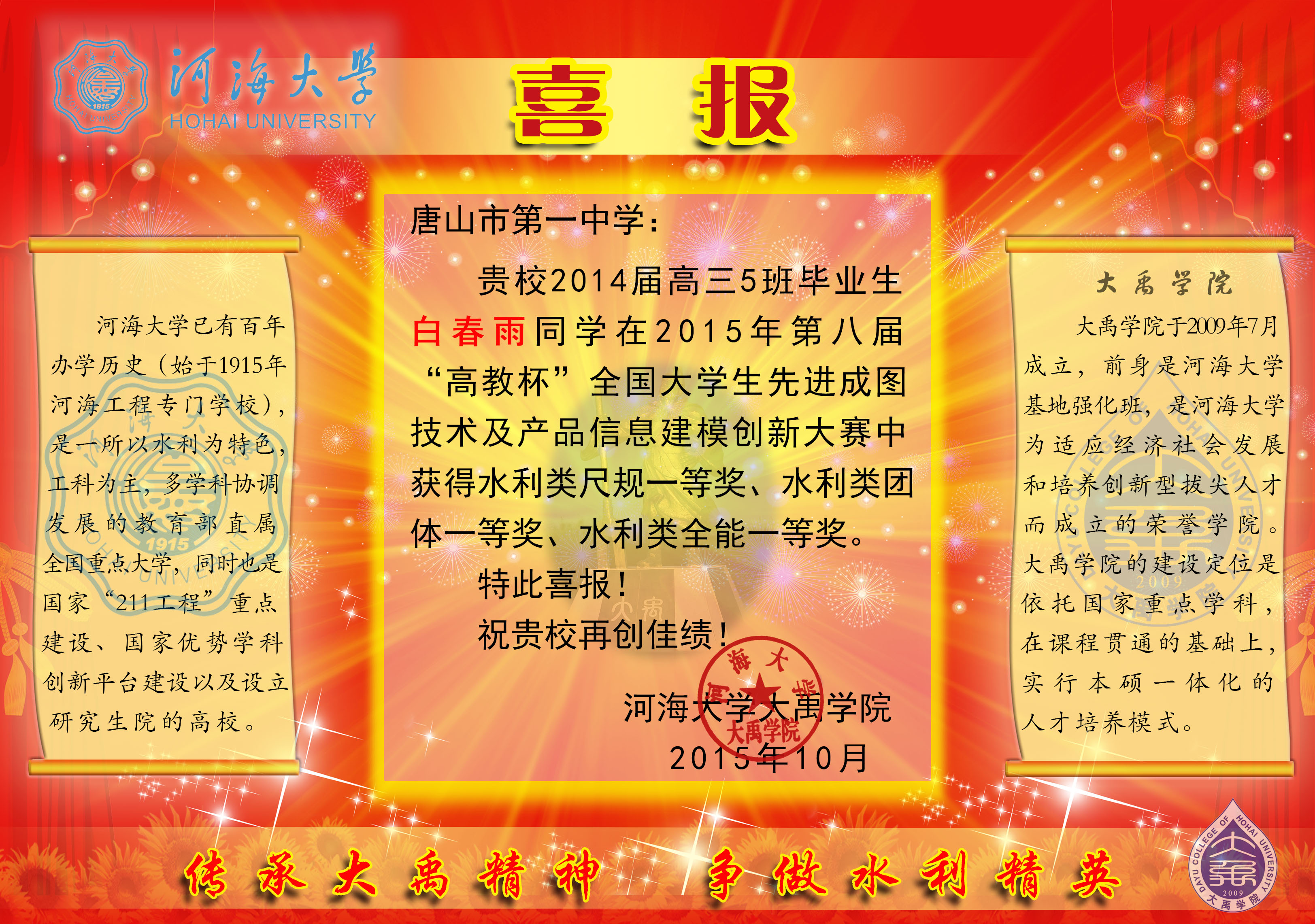 williamhill英国官网自成立以来一直以来致力于培养学术精英和高素质拔尖创新型人才,鼓励同学们参加各类学科竞赛及科研创新活动。为激励同学们参加此类活动的热情,公司决定:凡获得省级以上荣誉的员工,公司通过制作喜报的形式,在全院进行张贴表扬,并将喜报寄往员工所在高中,与高中老师和同学们分享喜讯的同时,宣传了员工取得的优异成绩,提高了集团和公司的知名度。