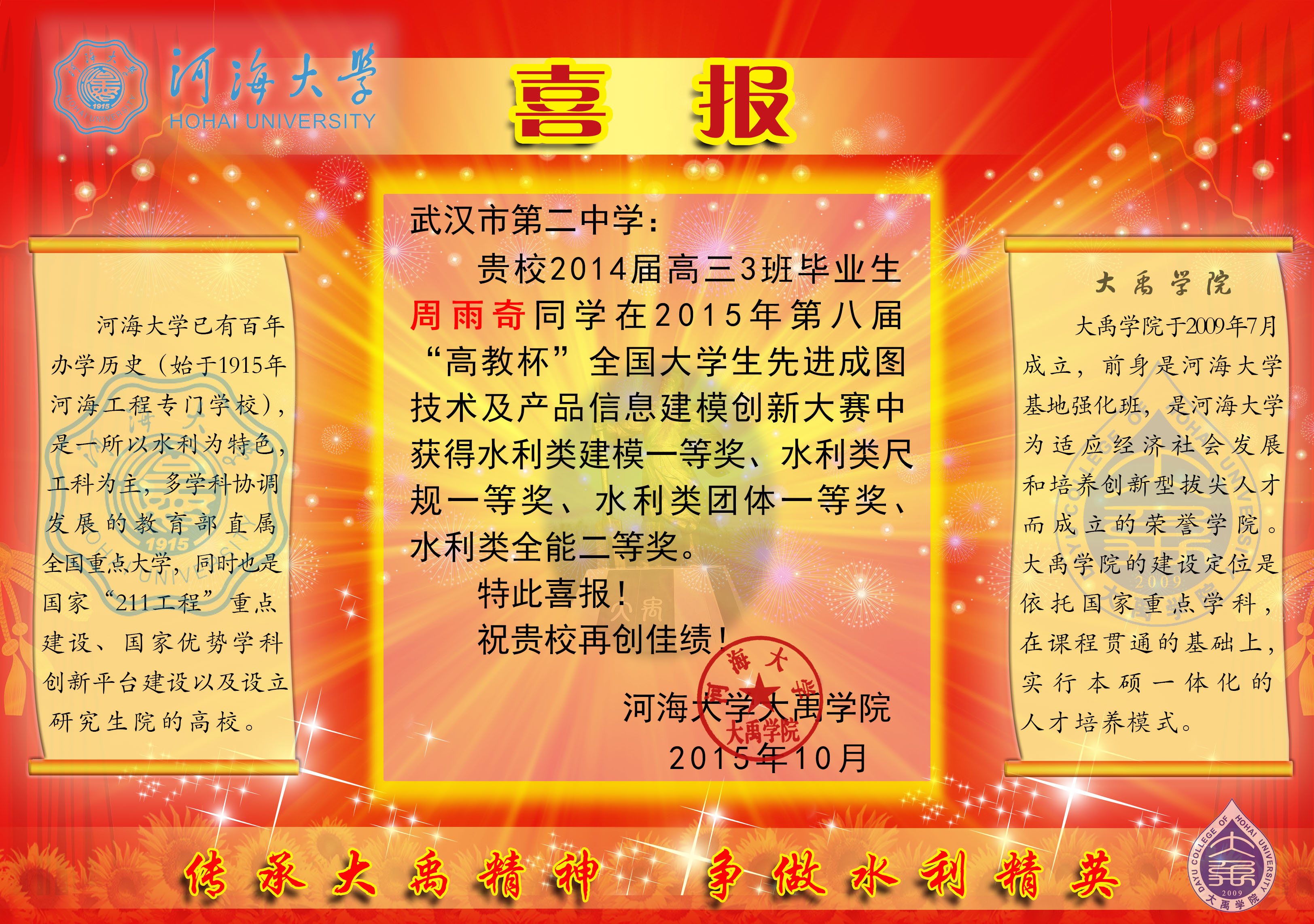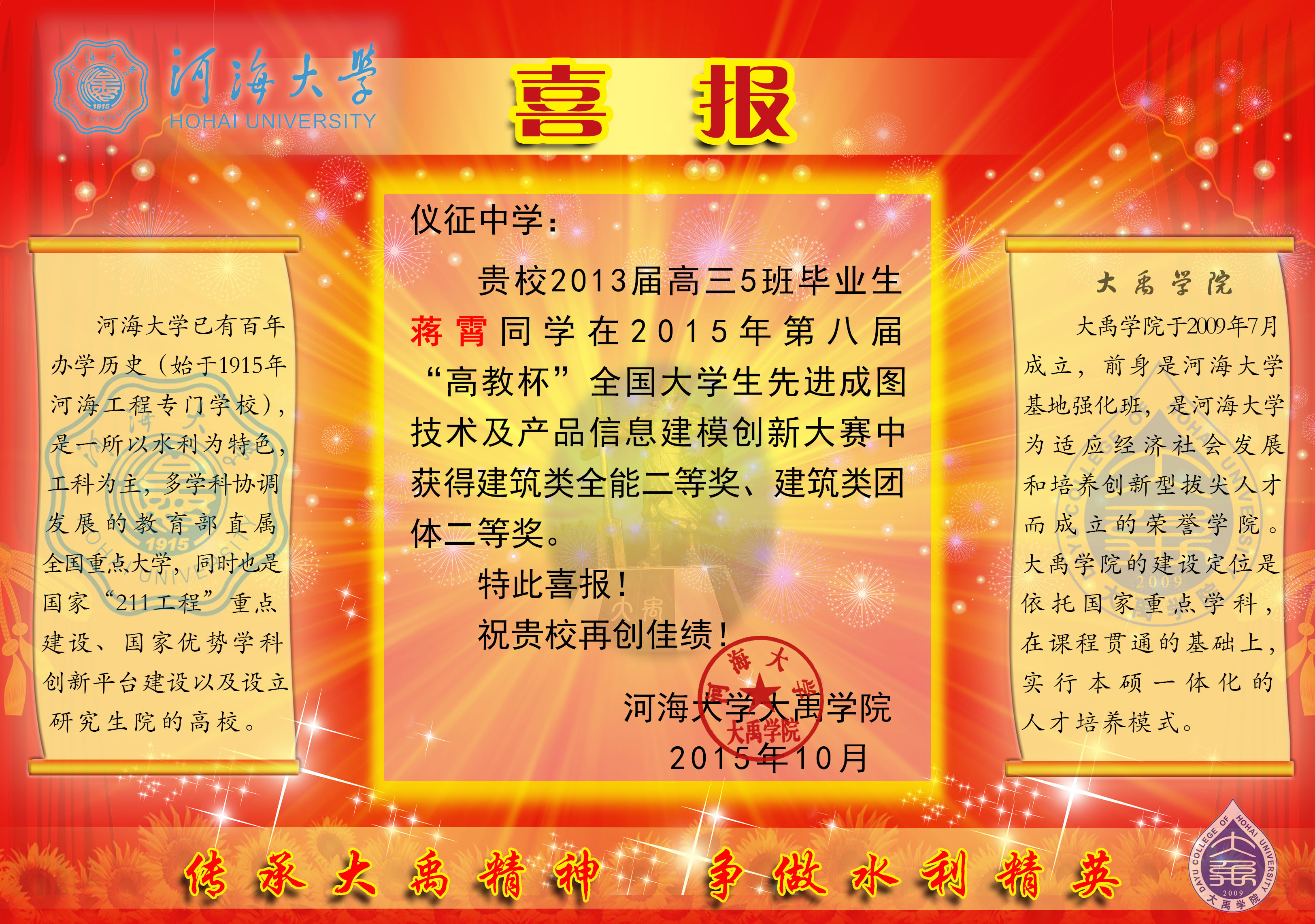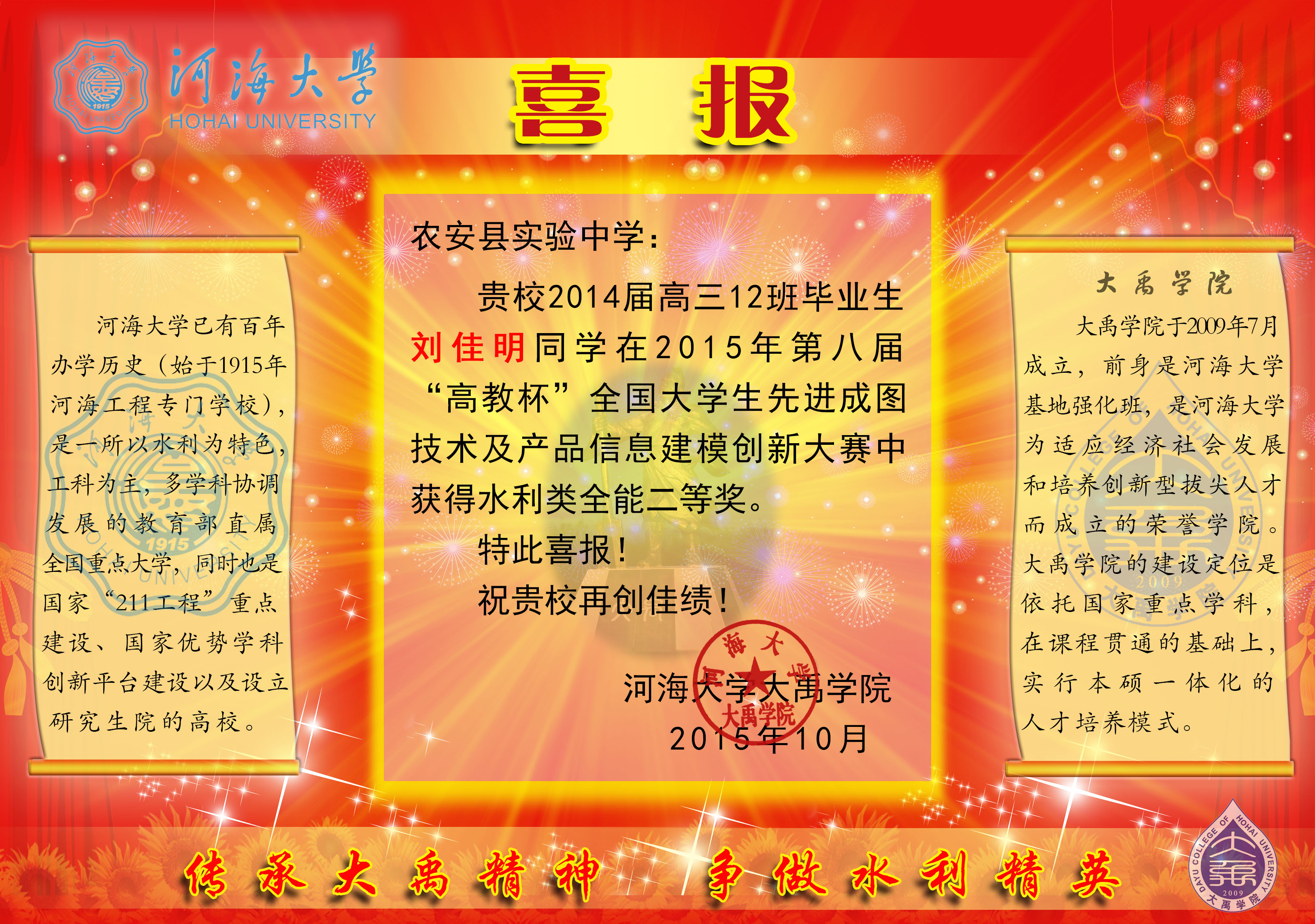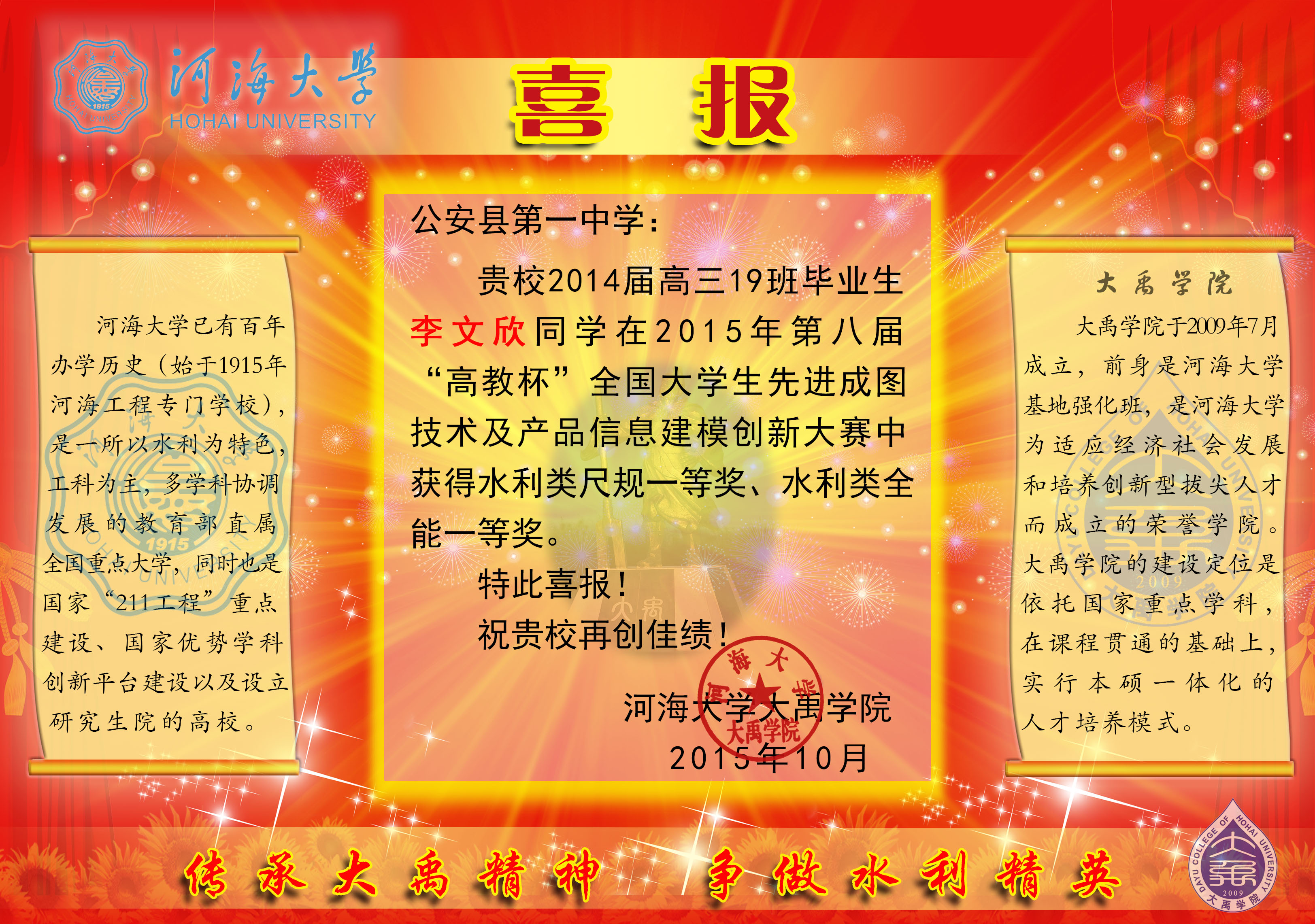 williamhill英国官网自成立以来一直以来致力于培养学术精英和高素质拔尖创新型人才,鼓励同学们参加各类学科竞赛及科研创新活动。为激励同学们参加此类活动的热情,公司决定:凡获得省级以上荣誉的员工,公司通过制作喜报的形式,在全院进行张贴表扬,并将喜报寄往员工所在高中,与高中老师和同学们分享喜讯的同时,宣传了员工取得的优异成绩,提高了集团和公司的知名度。