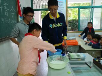 而在四年级五班,气氛也是异常活跃。由倒置矿泉水瓶和纸巾组成的简单装置使水不会向下泄漏的实验化无形为有形,让小员工感知到大气压强的真实存在;杨瑶同学还通过别出心裁的手绘节水点子明信片,与小朋友们讨论并交换节水小诀窍,真正让节水观念在小朋友们心中落地生根。陈禹同学则为大家解释了生活一些水溶液结晶的现象,教他们怎样巧除水垢的生活小技巧。最后压轴出场的黄思文同学讲解了怎样自制汽水,通过用简单的原料——白砂糖,纯净水,柠檬和小苏打成功制出了美味的“雪碧”,可爱的五班同学踊跃品尝,这个小实验更是点燃了小朋友们自己动手制作的热情。