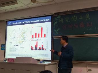 辛教授首先与大家畅谈大学的学习与生活,教授认为导师们不应该将自己的研究方向和价值观强加给员工。本科生应该做出自我选择,去广泛接触事物,将科研视为“自己的事”并投身于其中。在给大家传递自身成长经验后,辛教授向大家介绍了本次讲座的主体内容——滨海湿地地表水地下水生态地貌耦合模型(SGEM)。关于滨海湿地的变化,教授谈到了滨海湿地的残酷现状——人类活动、海平面的上升、入海江流悬沙量的减少、外来物种的入侵等问题都对滨海湿地构成了巨大威胁。为了对这些内容进行研究,研究人员通过建立数学、物理、生物等模型进行分析与模拟,从而归纳总结形成科学理论。这种研究的方法令同学们大开眼界。考虑到17级员工还没有太多学习专业知识,辛教授尽可能的用通俗的语言给大家介绍了该项目。互动环节,同学们积极提问,辛教授也热情回答了大家关于经济发展和保护湿地二者之间存在的矛盾等各方面的问题。