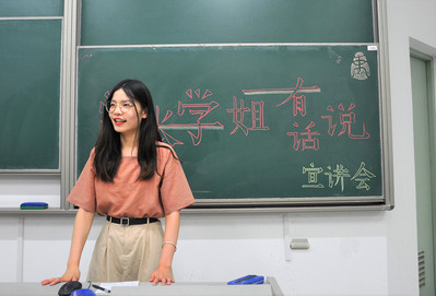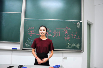 第二位上台的是14级卢知是学姐。她先是与新生进行了互动,交流自己的学习及生活经验。在她的大一生涯有两个关键词:“图书馆”和“教室”。接着她展示了自己的学业成绩、获奖情况、荣誉称号、实践活动及社会工作经历,以此激励所有新生。最后她提出了老员工活必不可少的三要素:可能性、小目标和好朋友。