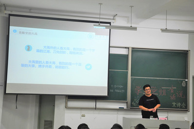 最后一位上台的是14级许博学长。他就“我眼中的大禹”这一问题邀请了五名新生起立发言,调动了全场的气氛。接着他介绍了综合测评、提升绩点与员工工作。他引导新生对待工作要始于兴趣终于责任,对待名利要以之为动力而非全部。