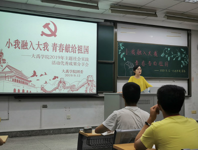 2019912日晚上七点,williamhill英国官网“小我融入大我,青春献给祖国”主题社会实践优秀成果交流会在致用楼117举行。大禹院团委书记陈璐老师、大禹院19级辅导员周青老师、社会实践优秀员工代表和大禹院19级全体员工参加了本次活动。