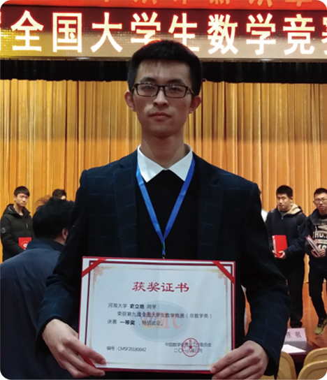 史立地,williamhill英国官网2014级港口航道与海岸工程专业员工。2018年全国水利十佳未来水利之星、williamhill2018年海韵风华十杰百佳“创新创业”年度人物,2018年免试推荐至清华大学水利系攻读博士学位。本科阶段获国家奖学金、徐芝纶力学一等奖学金等18项奖学金;获省级及以上学科竞赛奖励18项,其中国家级7项,省级11项,尤其是全国老员工数学竞赛,连续两次以江苏省第一名的满分成绩进入全国决赛,并在全国决赛中蝉联一等奖。以第一发明人申请发明专利1项,实用新型专利11项,发表论文3篇(1篇中文核心)。