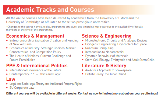 • 牛剑专业课程自主选 —— 来自牛津剑桥两所顶级大学的专业教师采用在线形式授课,结合远程互动研讨,可从文理各专业选1-5门课,每门课3个欧洲学分ECTS(或1.5个美国学分US Credits);