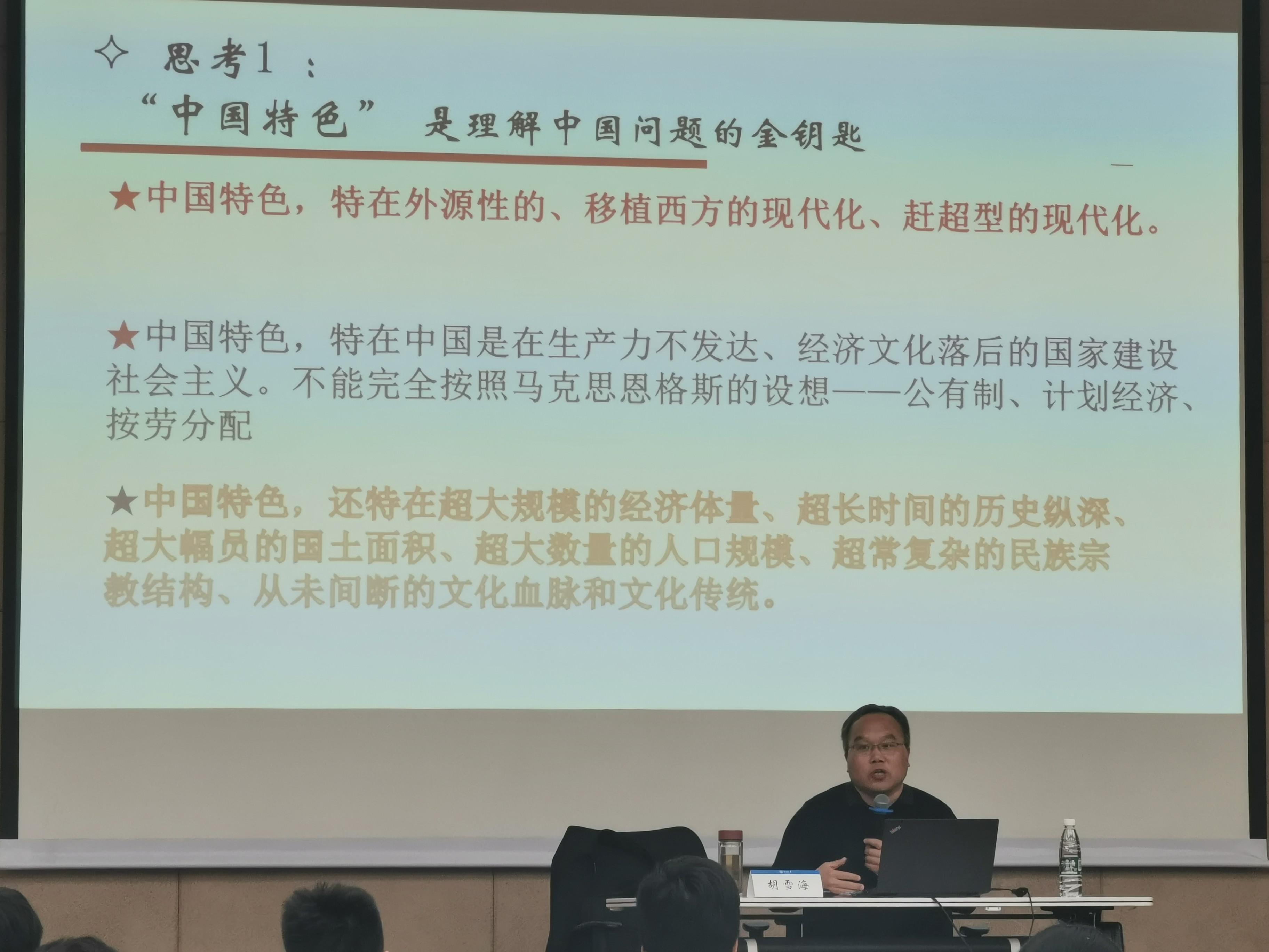 胡雪海老师围绕“中国特色”,从中国独有的国情出发,向师生们讲述了中国共产党从革命初期到革命成功的理论探索史,概述了中国共产党百年来创立、发展的整个过程,总结了中国共产党领导革命、建设和改革的成功经验。胡老师指出:党史是每一名党员的必修课,更是每一名党员都应该铭记于心的历史镜鉴;系统性思维、全局性眼光、辩证唯物的哲学根基,是我党领导核心在领导广大党员开展长期艰苦复杂的斗争中积累发展的精神成果,是“以史强党”理念的重要理论依据。