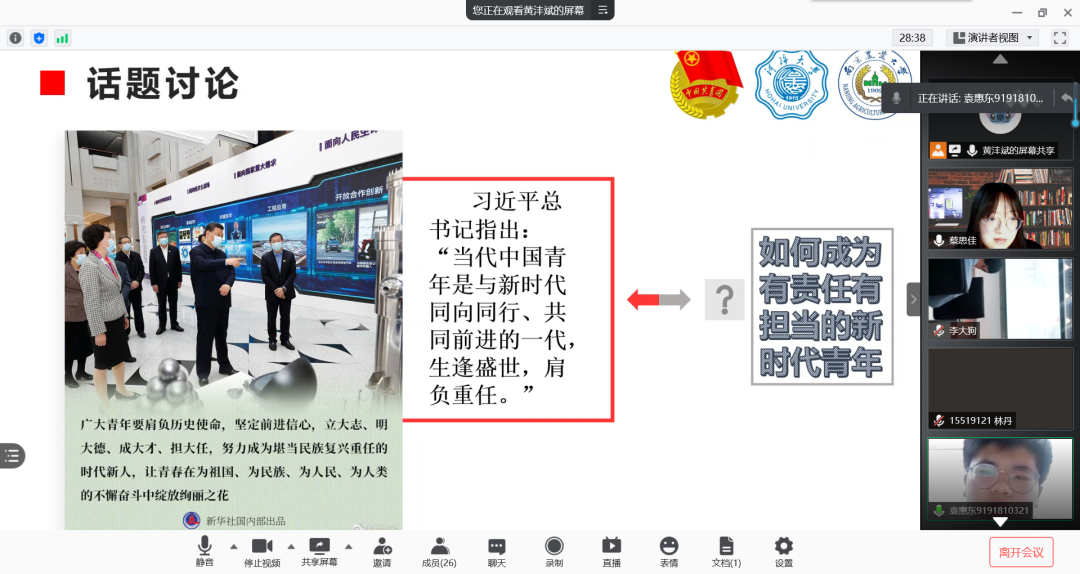 活动开始,主持人蔡思佳、黄沣斌带领同学们了解了“青年当肩负时代使命”这句话的含义。之后同学们围绕习近平总书记所说的“当代中国青年是与新时代同向同行、共同前进的一代,生逢盛世,肩负重任。”这一话题进行讨论,大家各抒己见,气氛热烈。