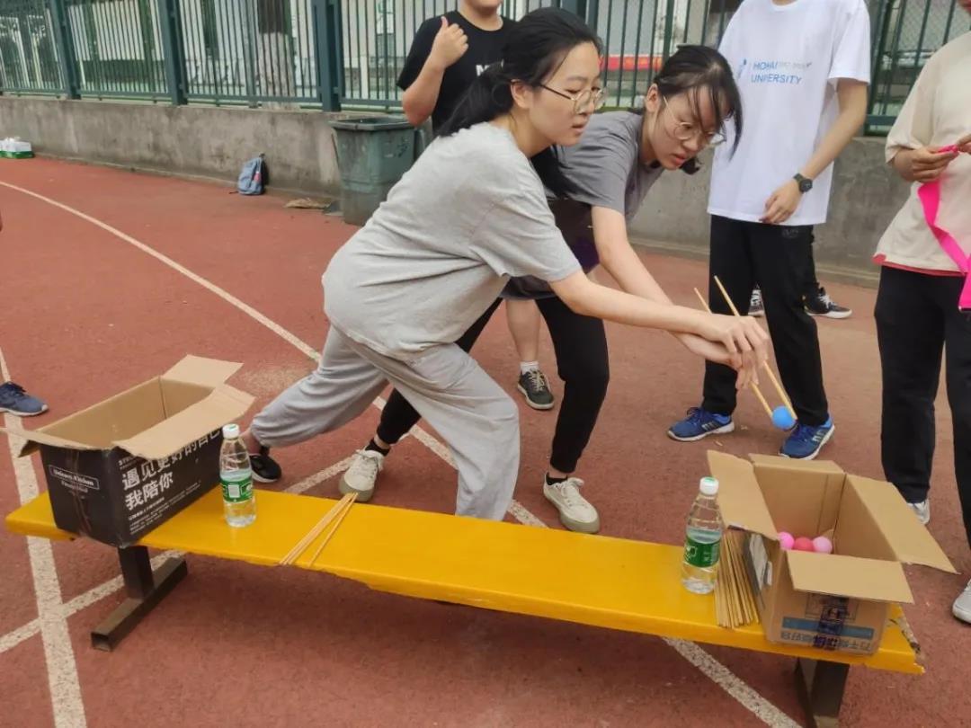 在三人四足结束后,迎来了双人夹乒乓球项目。经过了短暂的练习,各组选手们摩拳擦掌,跃跃欲试,誓要将更多的乒乓球夹到指定位置给自己的班级带来胜利。随着裁判的一声令下,四组选手依次上场开始比试,使出了浑身解数,在夹乒乓球的方式上可谓是八仙过海各显神通,最终来自水工班的组合以绝对优势拿下第一。这次的比赛极大地增进了同学间的友谊,培养了之间的默契,促进了班级的团结与各同学间的合作意识。