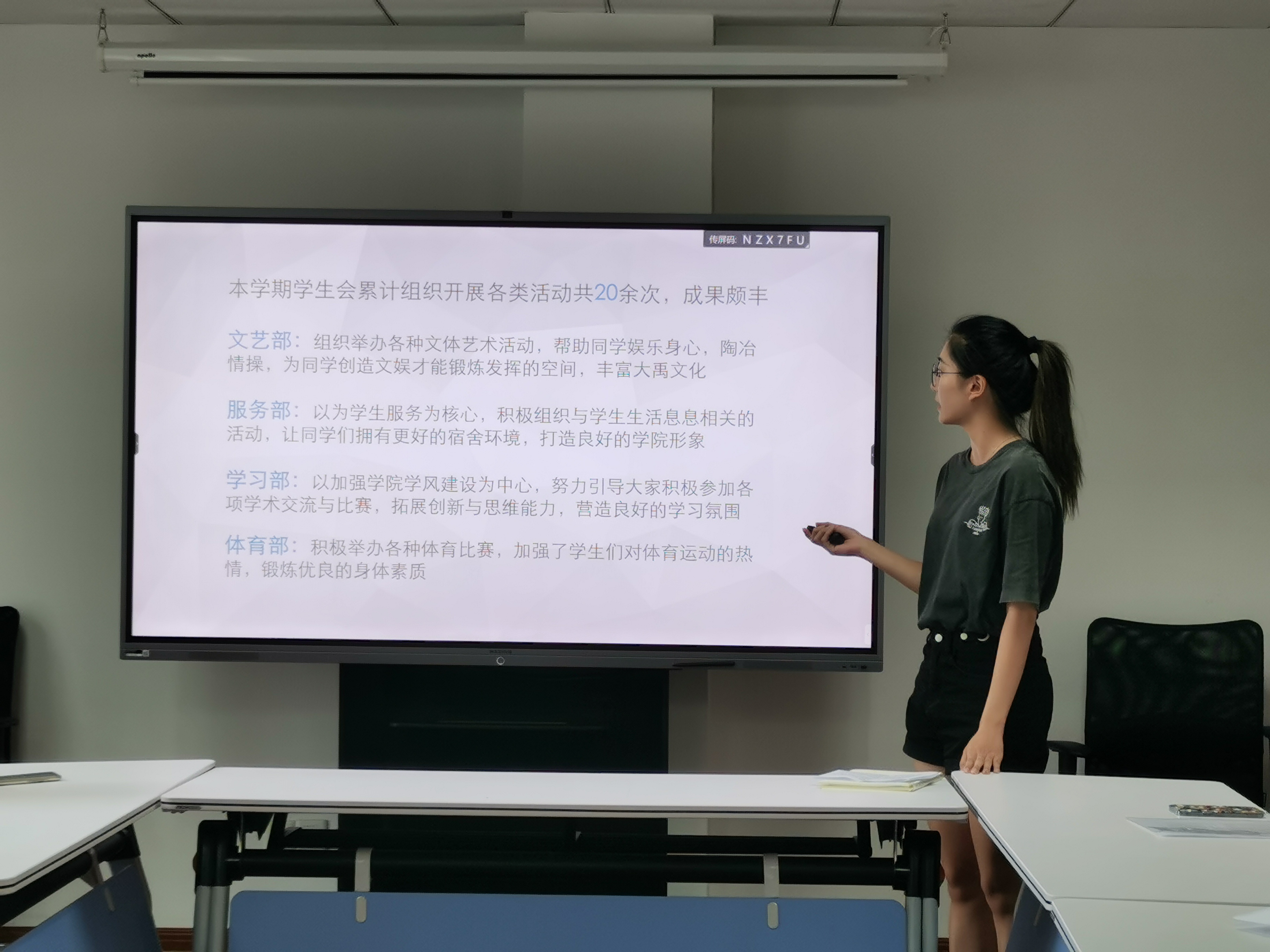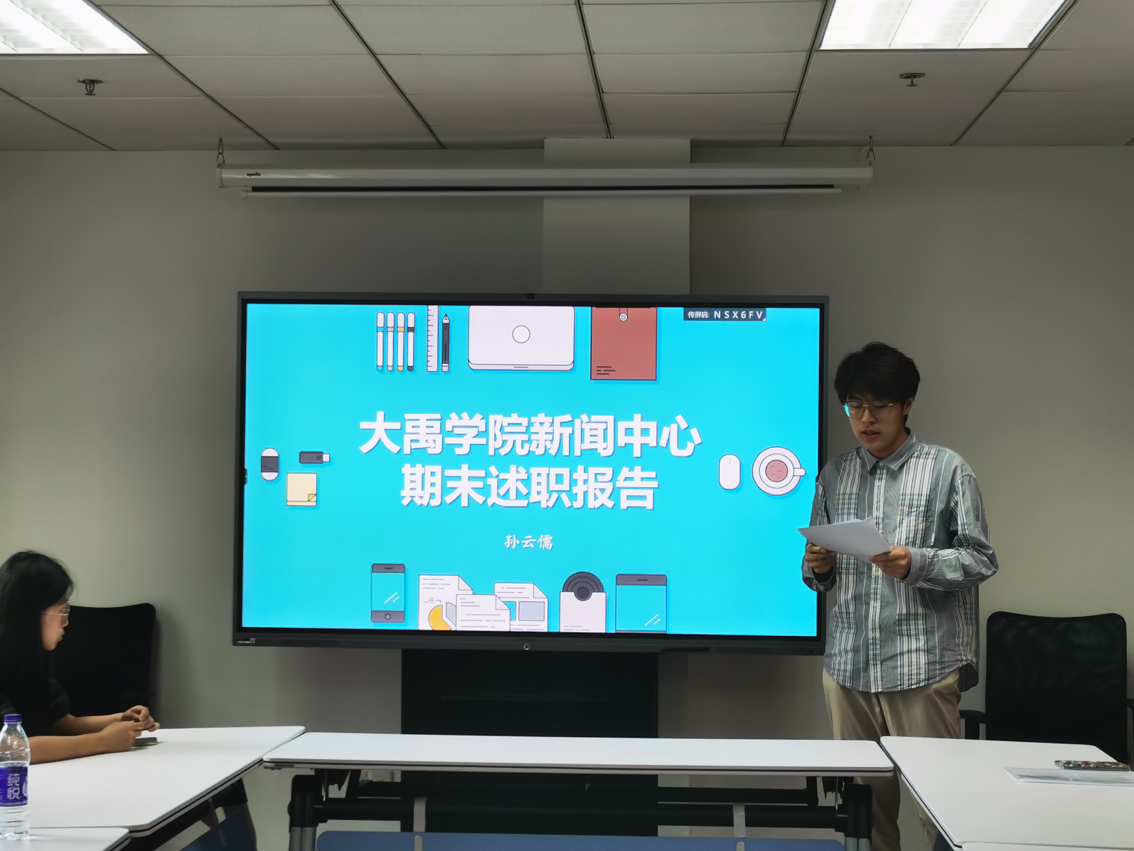 新闻中心副主席孙云儒总结了williamhill英国官网新闻中心本学期的工作情况,上半学年新闻中心致力于发掘大禹特色及员工需求,开展较往年更多更丰富的活动,从被动宣传向主动获取过渡并形成了“小禹滴创作激励计划”等一系列活动;新闻中心在原有的基础上不断探索,进一步完善组织各项事务,在组织队伍建设、推送质量、业务领域拓展方面得到了长足发展。新的学期,新闻中心会继续保持活力,改进不足,发挥价值,为大禹学子奉上更多优质的推文,提高公司整体的文学素养。