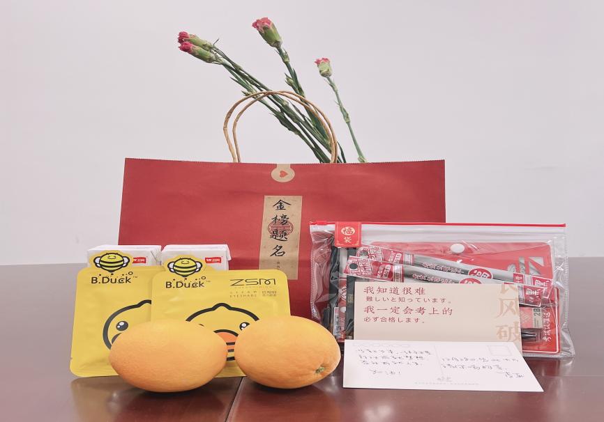 李瑶老师向同学们介绍了公司准备的考研礼物,两盒牛奶、两个橙子、两个蒸汽眼罩,以及考试必备用品,老师们手写的祝福卡,祝福每位同学能够好事成双、心想事“橙”、“牛”气冲天、“视”事顺心,金榜题名!