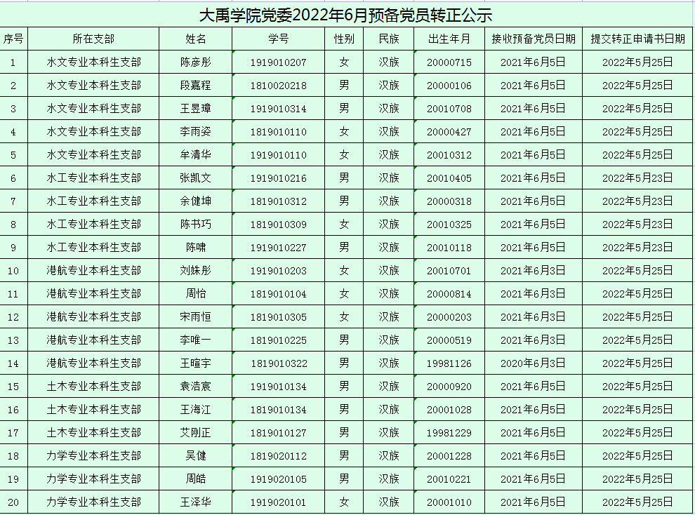 经公司党委会研究,近期拟同意陈彦彤同志等20名预备党员按期转为中共正式党员。现予以公示(基本情况详见附件)。