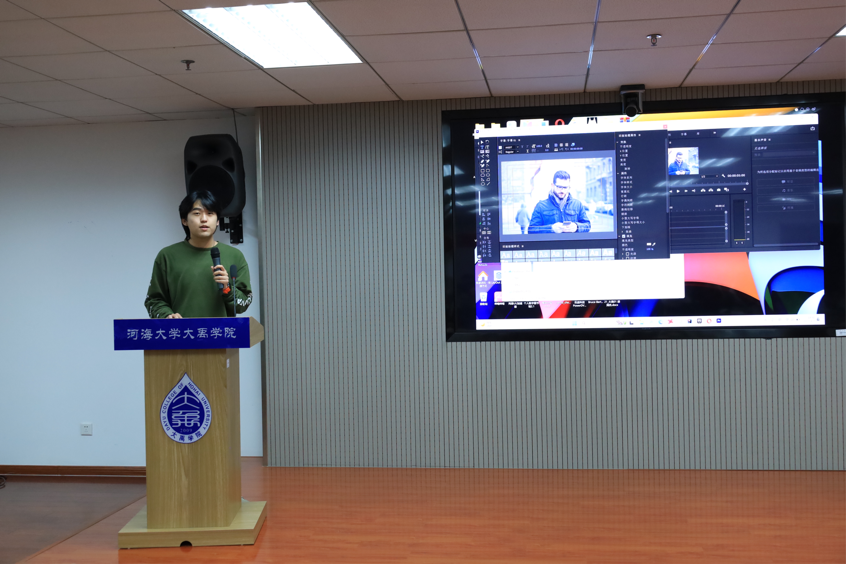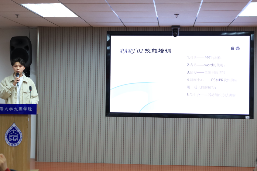 新闻中心视觉设计部部长姚泽鑫、邵润杰分别为大家培训了pr和ps,简明扼要地介绍了两种软件的基本操作流程;采访外宣部的李栓根围绕着通讯稿的基本内容、常见的问题和写稿前的注意事项三方面介绍了如何规范撰写通讯稿。